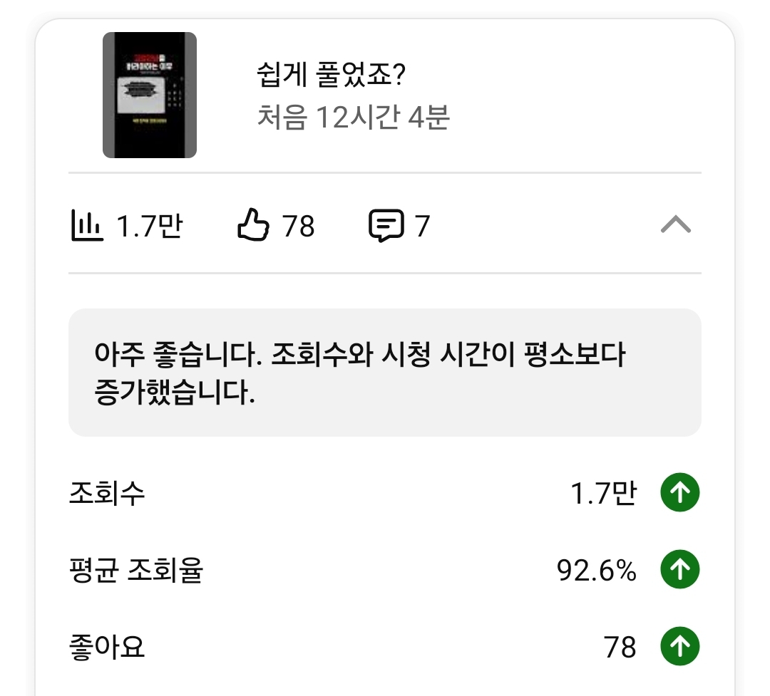 12시간만에 1.7만 조회수를 기록하며 일반 영상으로의 유입도 잘 되는 편입니다!