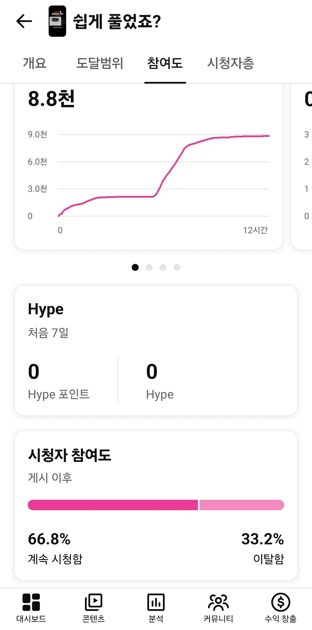 저녁에 게임이 끝나고, 새벽에 롱폼 편집이 끝나고, 이어서 숏폼을 편집하고 업로드하느라 새벽 3시경 ㅋㅋㅋ 업로드하였는데도 "시청자 참여도" 수치가 (제 채널 영상들 중에서는) 높은 편이라 그런지 알고리즘을 살짝 타게 되었습니다.